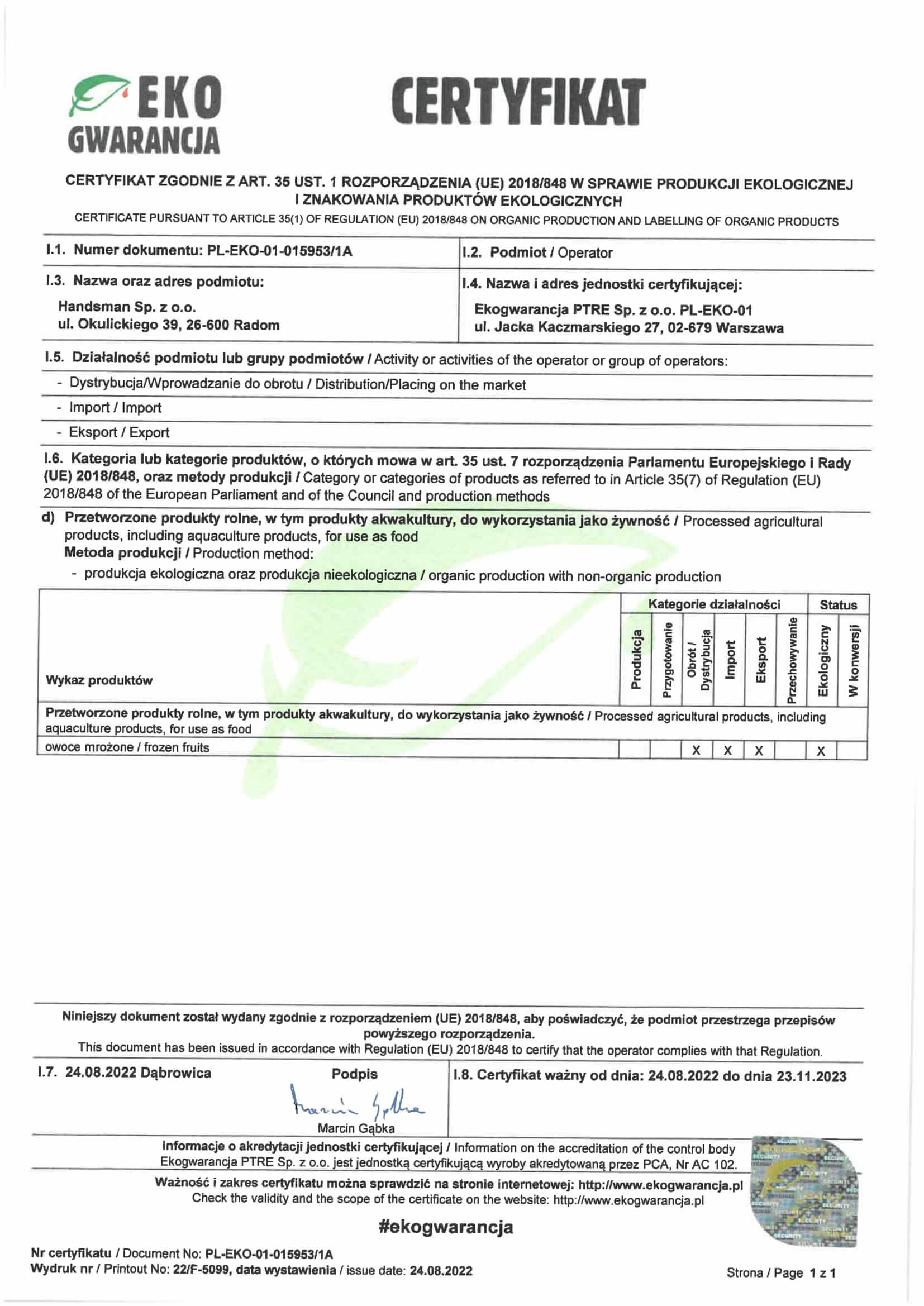 Certyfikaty - BRC FOOD, IFS, GLOBALG.A.P., HALAL, EkoProdukcja